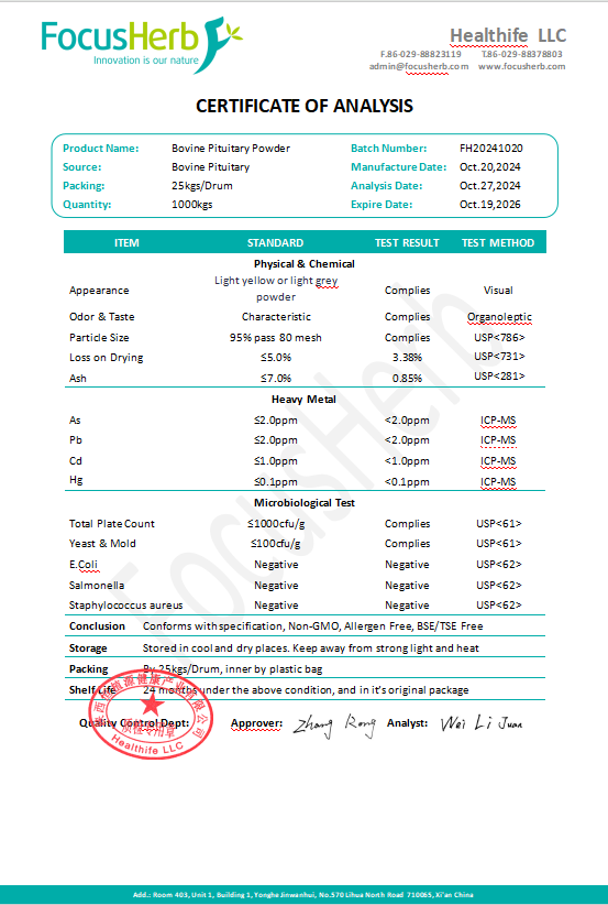 Bovine Pituitary Powder is rich in active components such as growth hormone (GH), which can stimulate the growth and development of bones, muscles, internal organs, and the nervous system. For children, a moderate intake of Bovine Pituitary Powder is conducive to promoting height growth and physical development; for adults, it can assist in maintaining the health of body tissues and enhancing physical fitness.