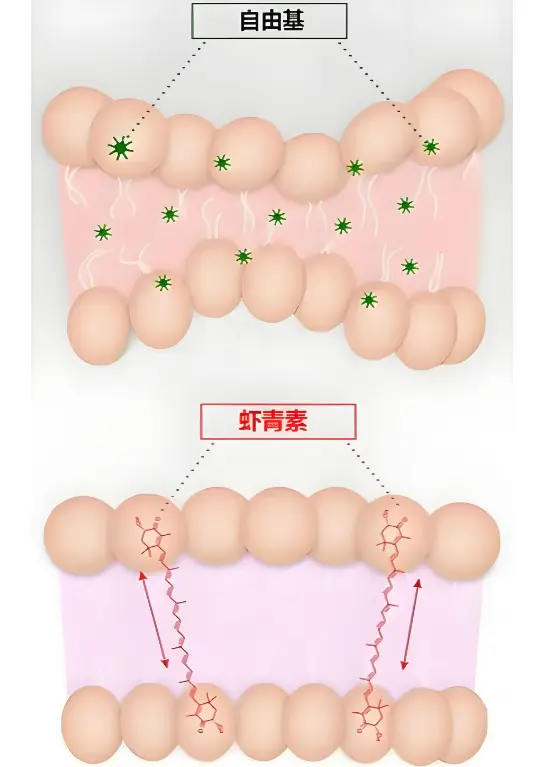 아스타잔틴은 세포막의 지질 이중층에서 단단한 “보호막”처럼 세포막을 가로질러 배열되어 활성 산소 종(ROS)이 탄소 골격의 이중 결합을 따라 이동하여 전자의 막 통과를 촉진할 수 있습니다. 이러한 방식으로 아스타잔틴은 세포막의 산화적 손상으로부터 ROS를 예방할 뿐만 아니라 세포의 다양한 소기관을 보호하고 세포의 정상적인 생리 기능을 유지할 수 있습니다.
