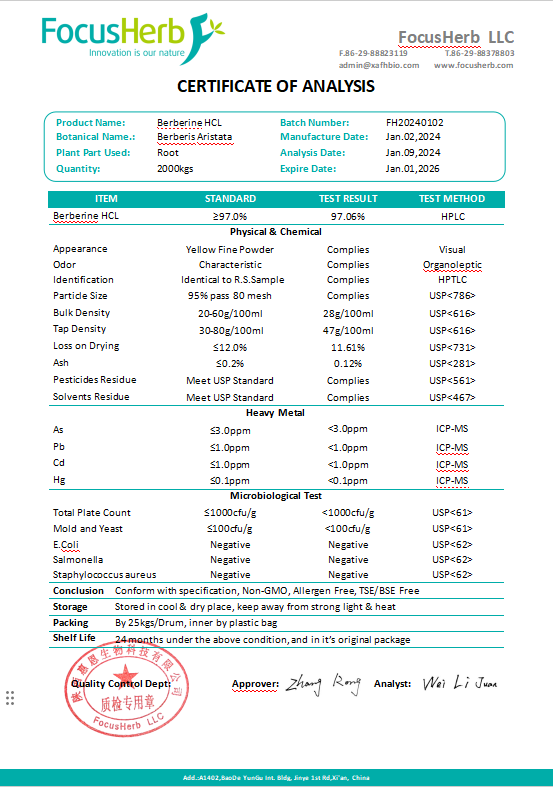 Berberine Hydrochloride, chemically known as Berberine Hydrochloride, is a yellow crystalline powder, odourless and extremely bitter in taste. It is soluble in water and ethanol and insoluble in ether, chloroform and benzene. Berberine Hydrochloride has a stable chemical structure and is not easily oxidised or decomposed, therefore it has good drug stability.