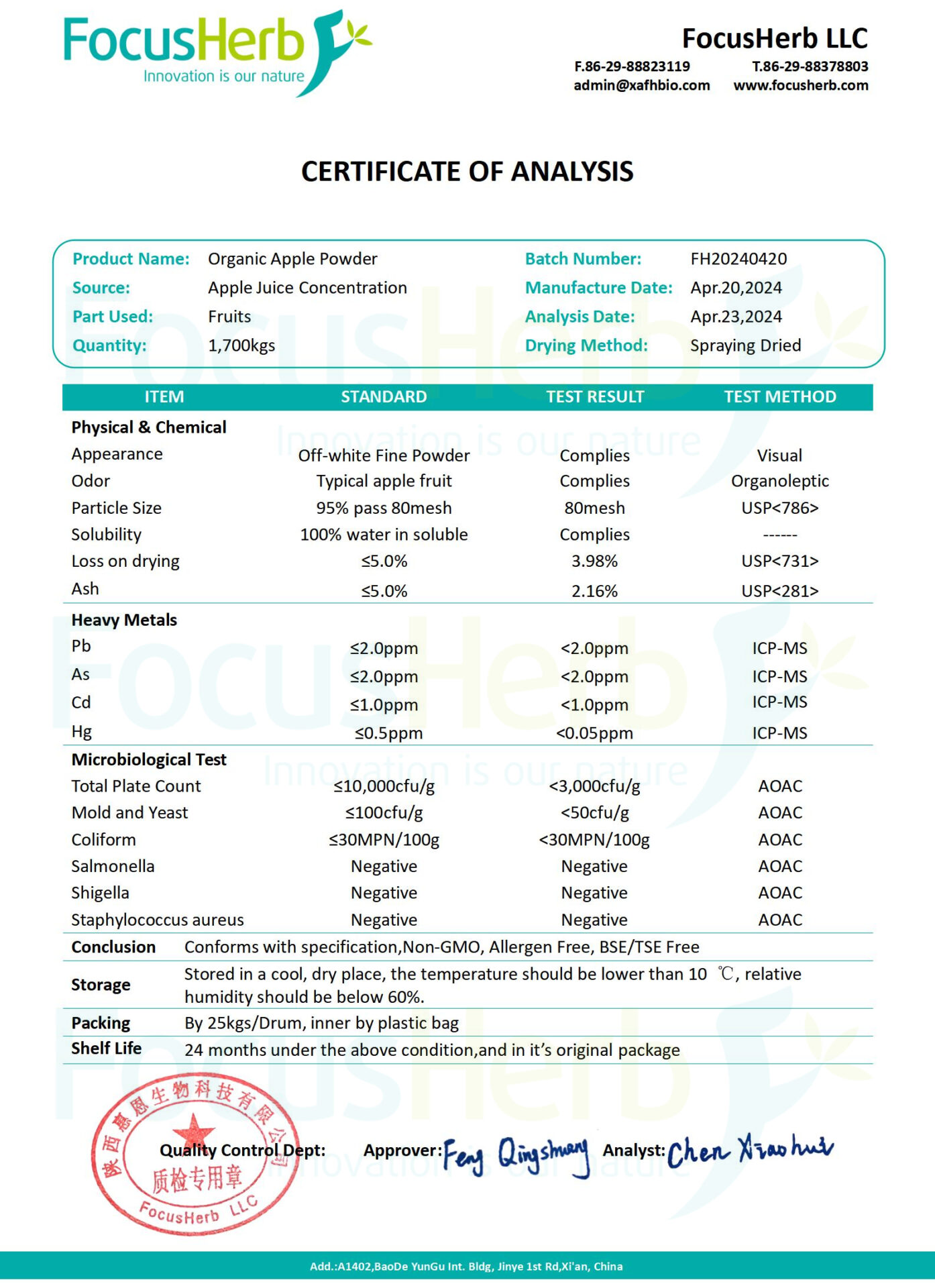 Organic Apple Power has been authenticated as organic quality with the certificates of USDA & EU organic as well as Kosher check and Halal. We can supply the Transaction Certificate (COI and NOP-IC) for your orders.