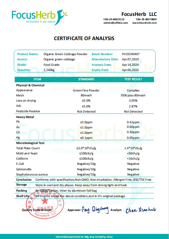 Organic Green Cabbage Powder has been authenticated as organic quality with the certificates of USDA organic, EU organic and JAS organic as well as Kosher check and Halal. We can supply the Transaction Certificate (COI) for your orders.