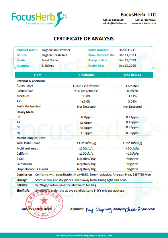 FocusHerb organic kale powder is certified USDA Organic, EU Organic and JAS Organic. Kosher check and Halal certified as organic quality. We can provide a certificate of transaction (COI) for your order.